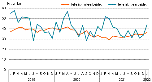 Figur 6. Udvikling i kilopris for hhv. ubearbejdet og bearbejdet hellefisk