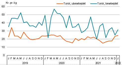 Figur 7. Udvikling i kilopris for hhv. ubearbejdet og bearbejdet torsk