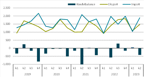 Handelsbalancen udviser dermed et underskud på knapt 367 mio. kr. i 1. halvår 2023, hvilket er 216 mio. kr. lavere i forhold til samme periode i 2022. Dog igen med forbehold for ændringer i forbindelse med indarbejdningen af køb og salg af skibe og fly.