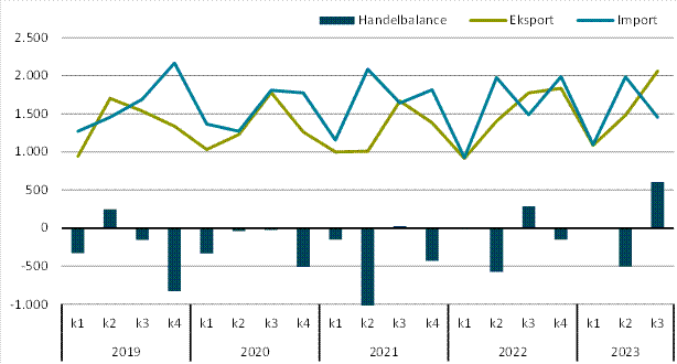 Handelsbalancen udviser dermed et overskud på 89 mio. kr. i 1-3. kvartal 2023, hvilket er 384 mio. kr. højere i forhold til samme periode i 2022. Dog igen med forbehold for ændringer i forbindelse med indarbejdningen af køb og salg af skibe og fly.