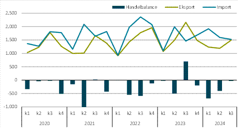 Handelsbalancen udviser dermed et underskud på 1.113 mio. kr. i 1-3. kvartal 2024, hvilket er 1.283 mio. kr. lavere i forhold til samme periode i 2023. Dog igen med forbehold for ændringer i forbindelse med indarbejdningen af køb og salg af skibe og fly.