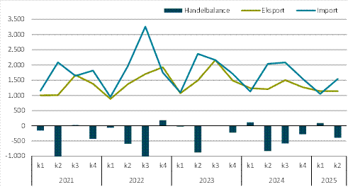 I oversigt 2 er importen, eksporten og handelsbalancen fordelt på måneder for årene 2021 til 2025.