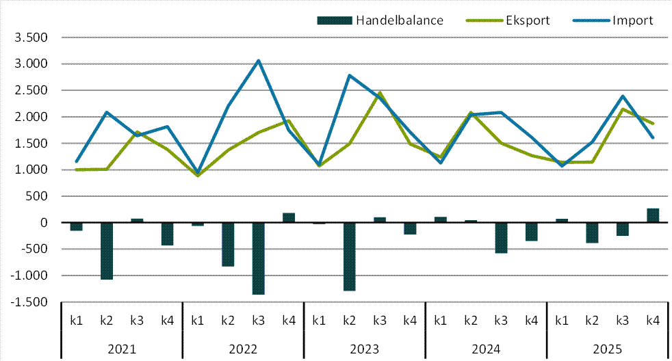 Værdien af import faldt i forhold til samme periode sidste år med 3,9 pct. Hvorimod eksporten steg med 3,4 pct. Handelsbalancen for 2025 endte dermed i et underskud på 270 mio. kr. Tallene skal dog fortolkes med varsomhed, da der stadigvæk er tale om foreløbige tal. Især SITC-afsnit 7 Maskiner og transportmidler kan komme til at ændre på billedet når Grønlands Statistik har indarbejdet rederiernes køb af skibe og fly.