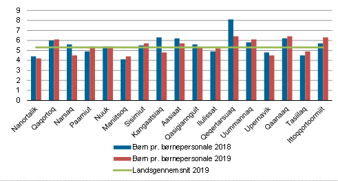 For at sammenligne børn i forskellige aldersgrupper og for at angive børn pr. børnepersonale, er der lavet en omregning af børn til børneenheder. Et vuggestuebarn svarer til 1,67 børneenheder og et børnehavebarn svarer til 1 børneenhed. I 2019 var landsgennemsnittet 5,3 børneenheder pr. børnepersonale. Børn pr. børnepersonale, er afhængig af forholdet mellem børn og personalet, f.eks. kan et lavere tal skyldes færre børn eller mere personale.