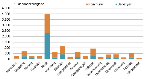 I 2020 var der i Nuuk distriktet 3.961 fuldtidsbeskæftigede, heraf 2.291 med ansættelse i Selvstyret og 1.670 kommunalt ansatte. I Ittoqqortoormiit distriktet var der samlet 71 fuldtidsbeskæftigede, heraf 7 fra Selvstyret og 64 fra kommunen.