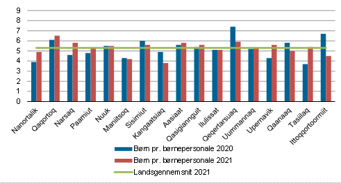 Personalet på institutionerne er opdelt i 5 personalegrupper: ledere, pædagoger, pædagogisk uddannet, pædagogmedhjælpere og køkken- og rengøringsmedarbejdere. Ledere og køkken- og rengøringsmedarbejdere kaldet støttepersonale udgjorde 20,3 pct. af det samlede personale. Pædagoger, pædagogisk uddannet og pædagogmedhjælper er samlet opgjort som børnepasningspersonale (børnepersonale). Børnepersonalet bestod i 2021 af 16,3 pct. pædagoger, 29,5 pct. pædagogisk uddannet og 54,2 pct. pædagogmedhjælpere.