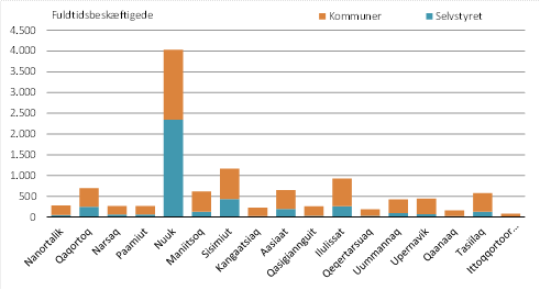 I 2021 var der i Nuuk distriktet 4.033 fuldtidsbeskæftigede, heraf 2.346 med ansættelse i Selvstyret og 1687 kommunalt ansatte. I Ittoqqortoormiit distriktet var der samlet 82 fuldtidsbeskæftigede, heraf 6 fra Selvstyret og 76 fra kommunen.