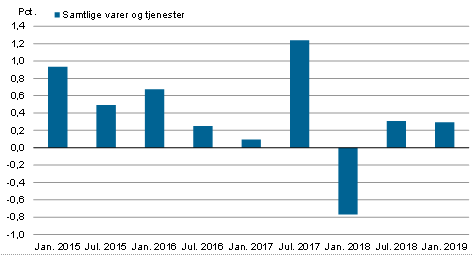 Forbrugerpriserne er det seneste halve år, for perioden juli 2018 til januar 2019 steget med 0,3 pct. De halvårlige ændringer i procent i forbrugerpriserne fra januar 2014 – januar 2018 er angivet i figur 2.
