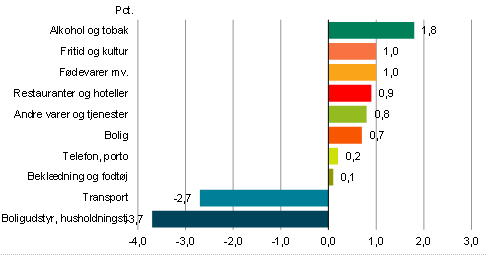 Udviklingen i forbrugerpriserne for samtlige varer og tjenester sker efter de underliggende varegruppers udvikling. Der er dog forskel i udviklingen for de enkelte varegrupper. Den årlige udvikling i perioden januar 2018 til januar 2019 for de enkelte varegrupper er vist i figur 3. Gruppen med den største stigning er Alkohol og Tobak. Derudover oplever andre varegrupper et prisfald, hvor de samlede priser på Transport samt boligudstyr, husholdningstjenester er faldet.
