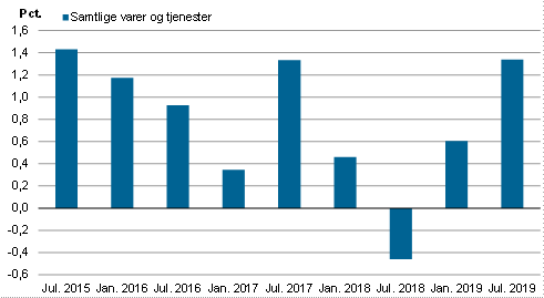 Forbrugerpriserne er det seneste halve år, for perioden januar 2019 til juli 2019 steget med 1,0 pct. De halvårlige ændringer i procent i forbrugerpriserne fra juli 2015 – juli 2019 er angivet i figur 2.