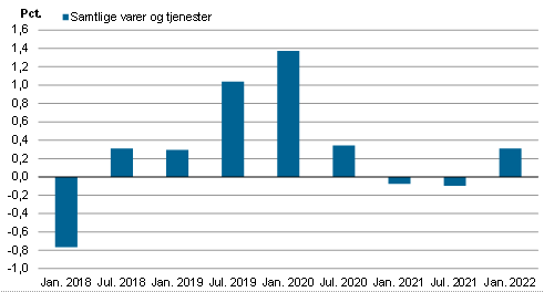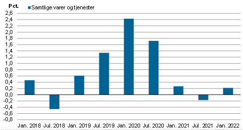 Forbrugerpriserne er det seneste halve år, for perioden juli 2021 til januar 2022 steget med godt 0,3 pct. De halvårlige ændringer i procent i forbrugerpriserne fra januar 2018 – januar 2022 er angivet i figur 2.