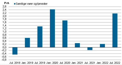 Figur 2. Forbrugerpriser, halvårlige ændringer i pct., juli 2018 - juli 2022