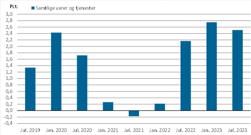 Det samlede forbrugerprisindeks for 1. juli 2023 steg 2,5 pct. i forhold til samme dato sidste år. Generelt var der stigninger indenfor næsten alle kategorier. Det var dog henholdsvis kategorierne Bolig og Fødevarer der havde den største indflydelse på den samlede stigning i indekset. Således steg fødevarer med 2,4 pct. mens Bolig steg med 5,3 pct.