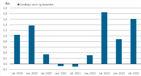 Forbrugerpriserne er det seneste halve år, for perioden januar 2023 til juli 2023 steget med 1,6 pct. De halvårlige ændringer i procent i forbrugerpriserne fra juli 2019 – juli 2023 er angivet i figur 2.