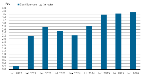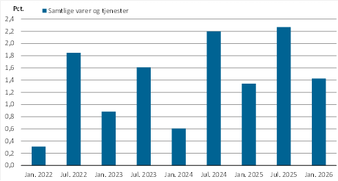 I perioden juli 2025 til januar 2026 steg forbrugerprisindekset med 1,4 pct. Denne udvikling er moderat i forhold til tidligere halvårsperioder, men den afspejler fortsat et generelt prispres i økonomien.