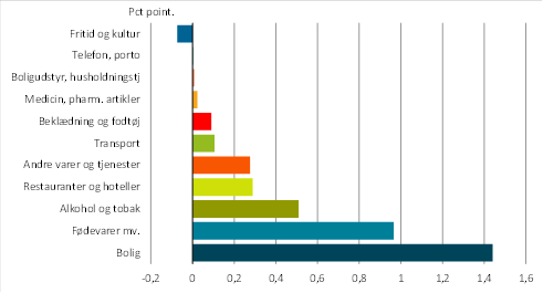 Omvendt var den største negative bidragsyder varegruppen beklædning og fodtøj, der oplevede et prisfald på -2,2 pct.