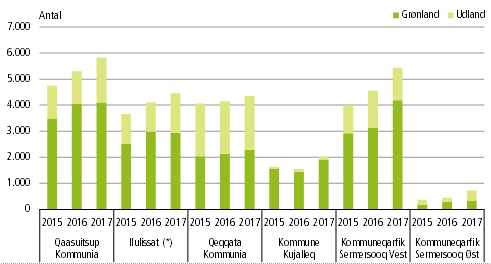 Der er en stigning på 14,7 pct. i antal overnatninger, sammenlignet med samme periode i 2016. Det er primært gæster af grønlandsk nationalitet, der har overnattet på hotellerne i 1. kvartal. Der er en betydelig større andel overnatninger foretaget af udenlandske gæster i Qeqqata Kommunia, end i de andre regioner, i 1. kvartal 2017.