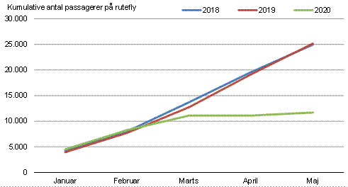 Figur 1. Kumulative antal passagerer på rutefly januar til maj, 2018-2020
