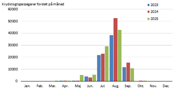 Figur 1. Antal krydstogtpassagerer fordelt på måneder, 2023-2025