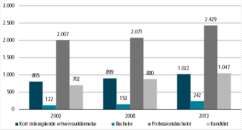 Indenfor de korte videregående erhvervsuddannelser er den største stigning at finde indenfor ledelse og virksomhedsadministration, som dækker over blandt andet akademiøkonomer. Der er sket en fordobling af antal personer med en bacheloruddannelse de seneste ti år, og der er især fremgang indenfor de samfundsvidenskabelige uddannelser. Folkeskolelærerne udgør den største andel indenfor professionsbachelorerne, mens flest jurister er at finde indenfor kandidaterne.