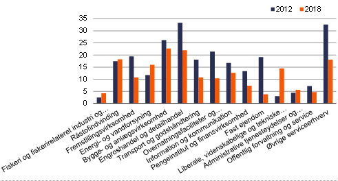 Figur 2. Lærlinge-kvoten opdelt på brancher, 2012 og 2018