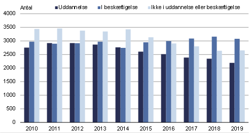 Andelen af unge der hverken var uddannelsesaktive eller i beskæftigelse udgjorde 33 pct. i 2019. Andelen er faldet 5 procentpoint siden 2014. I samme periode er andelen af unge i beskæftigelse steget med 8 procentpoint, mens de unge i uddannelse er faldet med 3 procentpoint.