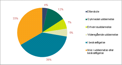 Nedenfor er de 7.917 unge i 2019 i populationen illustreret. Unge, der både er uddannelsesaktive og i beskæftigelse, er kun registreret som uddannelsesaktive. De unge, der er uddannelsesaktive, er yderligere inddelt i efterskole, ungdomsuddannelse og videregående uddannelse.
