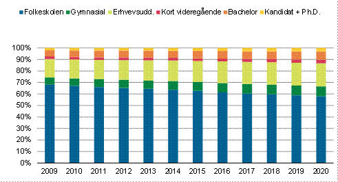 Heraf havde 13,3 pct. en videregående uddannelse, imens 28,7 pct. havde en gymnasial uddannelse, erhvervsuddannelse eller et suppleringskursus. Det er en stigning på hhv. 2,7 procentpoint og 5,8 procentpoint på 10 år.