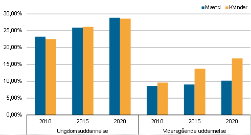 Den største forskel er inden for de videregående uddannelser. I 2020 havde 16,8 pct. af kvinderne en videregående uddannelse mod 10,2 pct. af mændene. Det er især andelen af kvinder med en videregående uddannelse som er steget de sidste 10 år. Stigningen inden for de videregående uddannelser er hovedsageligt sket indenfor professionsbacheloruddannelserne.