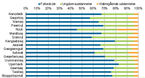 Uddannelsesniveauet er størst i Nuuk distriktet, hvor 57 pct. af befolkningen havde en uddannelse ud over folkeskolen mod et landsgennemsnit på 42 pct. Derefter følger Qaqortoq og Sisimut distrikt med hhv. 45 og 42 pct. og ligger der også over landsgennemsnittet.