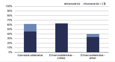 Note: Gymnasial uddannelse indeholder kun den 3 årige uddannelse. Gennemførelsesprocenten er opgjort ultimo året for studerende, som påbegyndte uddannelsen for første gang i året i parentes: Gymnasial uddannelse (2016), kortere erhvervsuddannelser (2017), erhvervsuddannelser (2015). Normeret tid er opgjort i antal hele kalenderår og sat til 3 år for gymnasial uddannelse, 2 år for kortere erhvervsuddannelser og 4 år for almene erhvervsuddannelser.