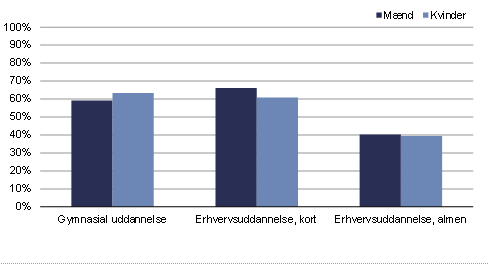 63 pct. af kvinderne fra årgang 2016 gennemførte en gymnasial uddannelse mod 59 pct. af mændene. På de kortere erhvervsuddannelser gennemførte 61 pct. af kvinderne fra årgang 2017 mod 66 pct. af mændene. Fra årgang 2015 på de almene erhvervsuddannelser gennemførte 39 pct. af kvinderne, og 40 pct. af mændene.