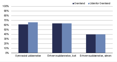 Både på de kortere og de almene erhvervsuddannelser var der en større andel af de studerende i Grønland, som gennemførte uddannelsen i forhold til de studerende i udlandet. Henholdsvis 63 pct. og 40 pct. af de studerende i Grønland fra 2017/2015 havde gennemført erhvervsuddannelsen inden normeret tid + 2 år. Hos de studerende uden for Grønland havde 64 pct. og 40 pct. gennemført.