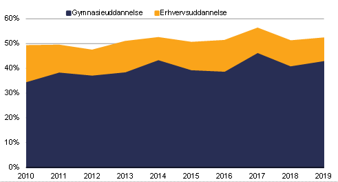 Andelen af folkeskolens afgangselever, der inden for 2 år efter eksamen, starter på en ungdomsuddannelse, har historisk ligget på omkring 50 pct.
