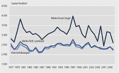 I figur 1 ses udviklingen i den samlede fertilitet for de 3 befolkningsgrupper. De relativt store årlige udsving især for mødre bosat i bygd skyldes at befolkningen er for lille til at skjule de tilfældige udsving. Af figuren konkluderes at den samlede fertilitet har været faldende over de sidste 15 år.