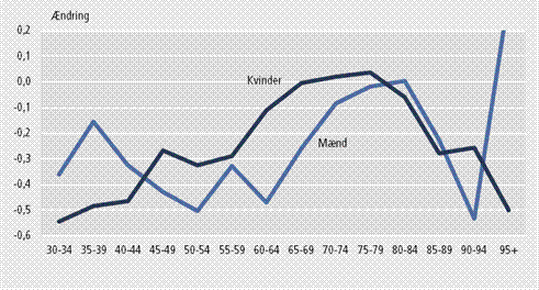Figur 5. Aldersbetinget relativ ændring i dødelighed (1986-1990/2006-2010)