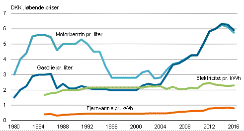 I 2016 var den gennemsnitlige literpris på motorbenzin 5,75 kr. mod 6,12 kr. året før. Det svarer til et fald på 6,0 pct. Literprisen på gasolie til husholdninger var 5,90 kr. i 2016 mod 6,27 kr. året før svarende til et fald på 5,9 pct. Siden indførslen af en miljøafgift på energiprodukter pr. 1. januar 2011 har afgiften på såvel motorbenzin som gasolie udgjort 0,10 kr. pr. liter.