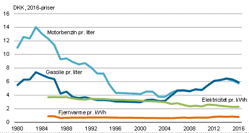 Målt i 2016-priser faldt prisen på motorbenzin med 6,9 pct. i 2016 i forhold til 2015. I samme periode faldt prisen på gasolie med 6,7 pct.