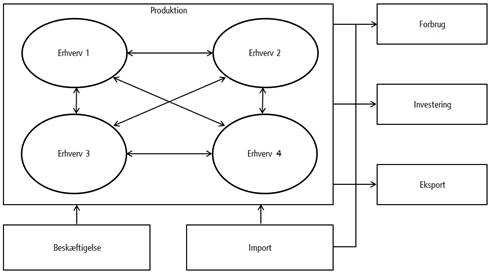 I figuren nedenfor anskueliggøres, hvorledes varerne bevæger sig rundt i økonomien. I kassen produktion findes de enkelte erhverv, i dette tilfælde 4. Produktionen i erhvervene foregår ved, at de enkelte erhverv modtager en række varer og tjenesteydelser, dels fra de andre erhverv og dels ved import. Disse varer forarbejdes til andre varer og tjenester, som leveres enten til andre erhverv, hvor de forbruges som råvarer, eller til endelig anvendelse, dvs. til konsum, investering eller eksport.