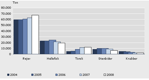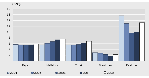 Udviklingen i den gennemsnitlige kilopris for rejer, hellefisk, torsk, stenbider og krabber fremgår af Figur 2. Detaljerede oplysninger om indhandlingsmængde og -værdi fremgår af Tabel 8.