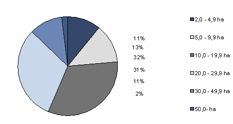 I 2007 var der 51 bedrifter. Gennemsnitsstørrelsen på en bedrift er cirka 19 hektar. Det er væsentligt mindre end i Danmark, hvor en bedrift gennemsnitlig er 58 hektar. De fire største bedrifter har et jordtilliggende på 30-50 hektar. Denne gruppe udgør 7 pct. af alle bedrifter. De fleste bedrifter har 10-20 hektar. Denne gruppe udgør 39 pct. af alle bedrifter. En mindre del af brugene har mindre end 5 hektar, jævnfør Figur 2.