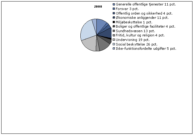Den funktionelle fordeling viser de offentlige udgifter, fordelt efter formål. I 2008 blev 58 pct. af udgifterne anvendt til de tre store områder, undervisning, sundhedsvæsen og social beskyttelse. Disse områder betragtes ofte som kerneydelser i et moderne velfærdssamfund.