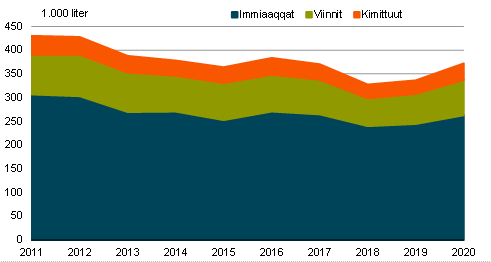 2020-mi imigassamik aalakoornartutalimmik 372 tusind literinik eqqussisoqarpoq tunisassiortoqarlunilu, titartagaq 1 takuuk. Ukiup siulianut sanilliullugu 36 tusind literinik imaluunniit 10,6 pct.-inik imigassamik aalakoornartutalimmik pilersuineq annertuseriarsimavoq. Imigassamik aalakoornartutalimmik pilersuineq 1991-imut sanilliutissagaanni 241 tusind literinik appariaateqarpoq. Ukiut 30-t ingerlaneranni imigassamik eqqussineq tunisassiornerlu taamaalilluni 39,3 pct.-inik appariarsimavoq.