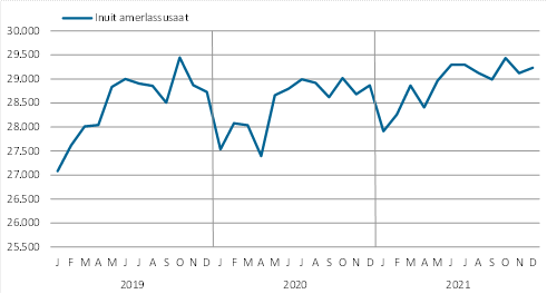 2021-mi agguaqatigiissillugu 28.909-t qaammammut suliffeqarsimapput, suliffeqarnermut nassuiaat immikkoortoq 4.1-imi takuuk. Ukiumut sulianut sanilliullugit 441-nik amerlanerupput, qaffariaat 1,5 pct.-iulluni. Qaffariaat naatsorsuutaareerpoq, Naatsorsueqqissaartarfimmit suliffissarsiortutut nalunaarsimasunut 2020-miit 2021-imut qaammatikkaartumik naatsorsuutiini takuneqarsinnaammat agguaqatigiissinneri appariaateqarsimasut.