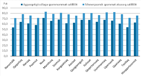 Suliffeqarneq inuussutissarsiutinut pingaarnernut agguataaraanni, takussutissiaq 1 malillugu kommunit akornanni nikingassutsit annertupput. Kommunini tamani pisortaqarfinni ingerlatsineq kiffartuussinerlu suli annerpaalluni inuussutissarsiorfittut sulisitsisuuvoq. Assersuutigaluguli Avannaata Kommuniani, Kommune Qeqertalimmi aamma Qeqqata Kommuniani aalisarneq aalisakkanillu tunisassiorneq niuernerlu kommuninut allanut naleqqiullugit annertunerpaapput. Taamaasilluni Avannaata Kommuniani aalisarnermi aalisakkanillu tunisassiornermi niuernermilu sulisut 31,2 pct.-inik, Kommune Qeqertalimmi 19,0 pct.-inik Qeqqata Kommunianilu 16,8 pct.-inik annertussuseqarput, Kommuneqarfik Sermersuumi inuussutissarsiorfimmi pineqartumi sulisut 7,9 pct.-iinnaallutik.
