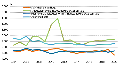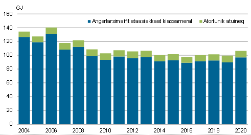 2020-mi angerlarsimaffinni atuineq tamarmiusoq 2.346 TJ nunami tamarmi atuinermut sanilliullugu 27,6 pct.-iusimalluni. Taakkunannga 2.140 TJ-t kiassarnermut atorneqarsimmpput 206 TJ innaallagiaq atorlugu atortunut atorneqarsimasut.