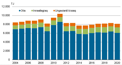 2004-mut sanilliullugu angerlarsimaffiit nukissiuutinik atuinerat allanngorsimaqaaq. Oliamik atuineq suli annertuneruvoq, kisianni ukiut ingerlanerini oliamik atuineq annikilliartuaarsimavoq. Tamanna innaallagiaq atorlugu kissamik aamma ungasianit kissamik atuilerneq kiisallu angerlarsimaffiit oqorsarluarneruneqartalerneri tamatumunnga pissutaapput. 2004-mi oliamik atuineq 2.155 TJ-usimasoq 2020-mi 1.486 TJ-uvoq, 31,0 pct.-imik apparsimalluni.