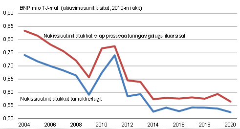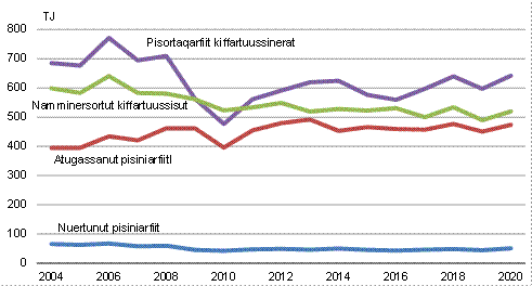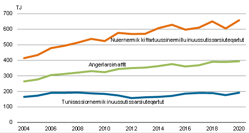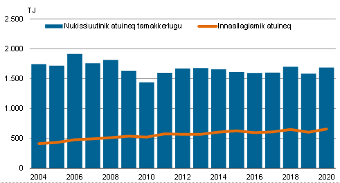Niuernermik aamma kiffartuussinermik inuussutissarsiortut tassaapput niuertunut tunisassiortut, atugassanik pisiniarfiit namminersortullu aamma pisortaqarfiit kiffartuussivii. 2020-mi nukissiuutinit atorneqarsimapput 1.686 TJ-t. Ukiup siulianut sanilliullugit 6,6 pct.-imik qaffasinneruvoq. 2004-mut sanilliullugu atuineq 3,3 pct.-imik apparsimavoq.