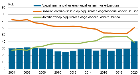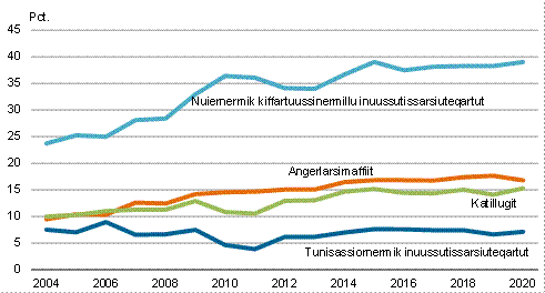 2020-mi innaallagiamik atuineq 8,8 pct.-imik qaffappoq, ungasianit kissaq 14,3 pct.imik qaffassimasoq ukiup siulianut naleqqiullugu. Oliamik atuineq 2020-mi 1,6 pct.-imik qaffappoq 2014-imut sanilliullugu, niuernermik aamma kiffartuussinermik inuussutissarsiortut akornanni, oliamik atuineq 30,4 pct.-imik apparsimavoq.