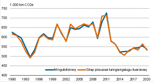 mingutsitsineq annikillivoq. 2020-mi GJ ataasiakkaarlugit 60,8 kg drivhusgassiusimapput 1990-imi 73,3 kg-usimasut.
